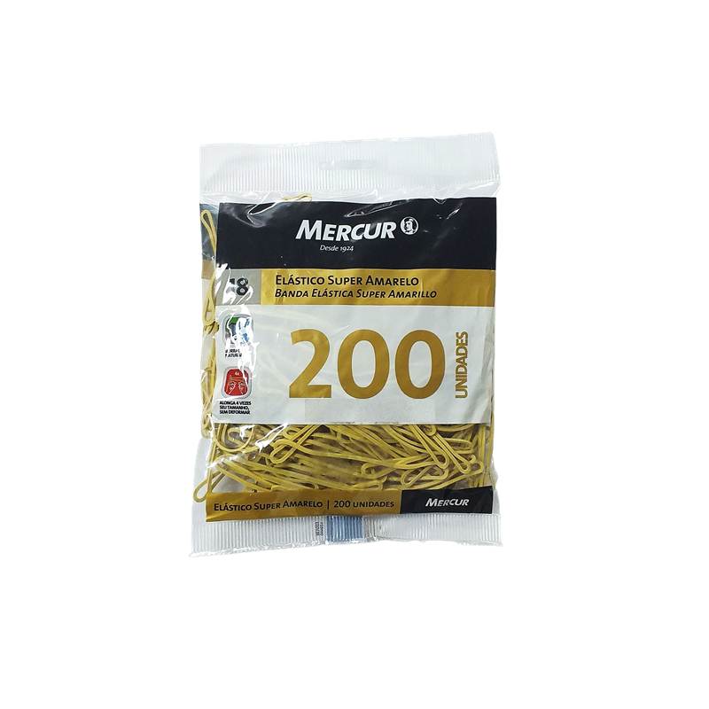 Gomitas Mercur, de 8,5 cm, elástico de goma natural color amarillo, resistente, ideal para organizar , agrupar, separar diversos objetos. El paquete contiene 200 unidades.